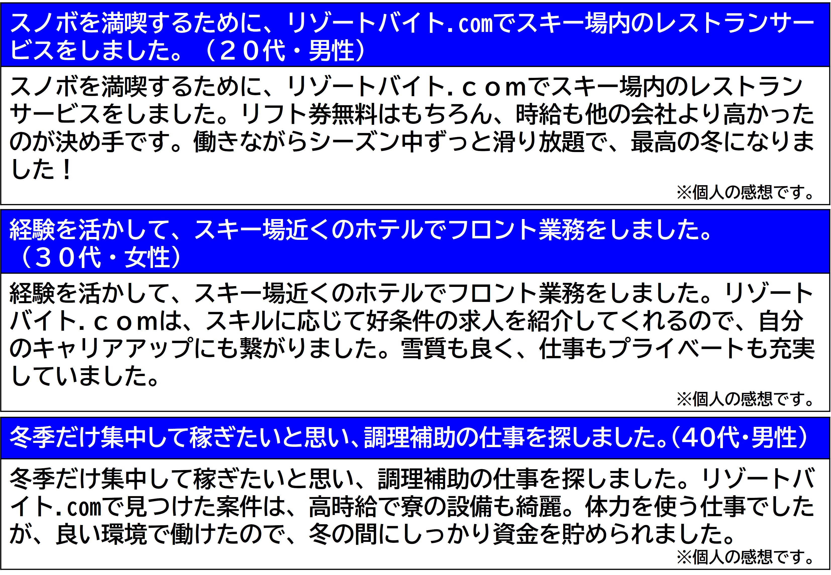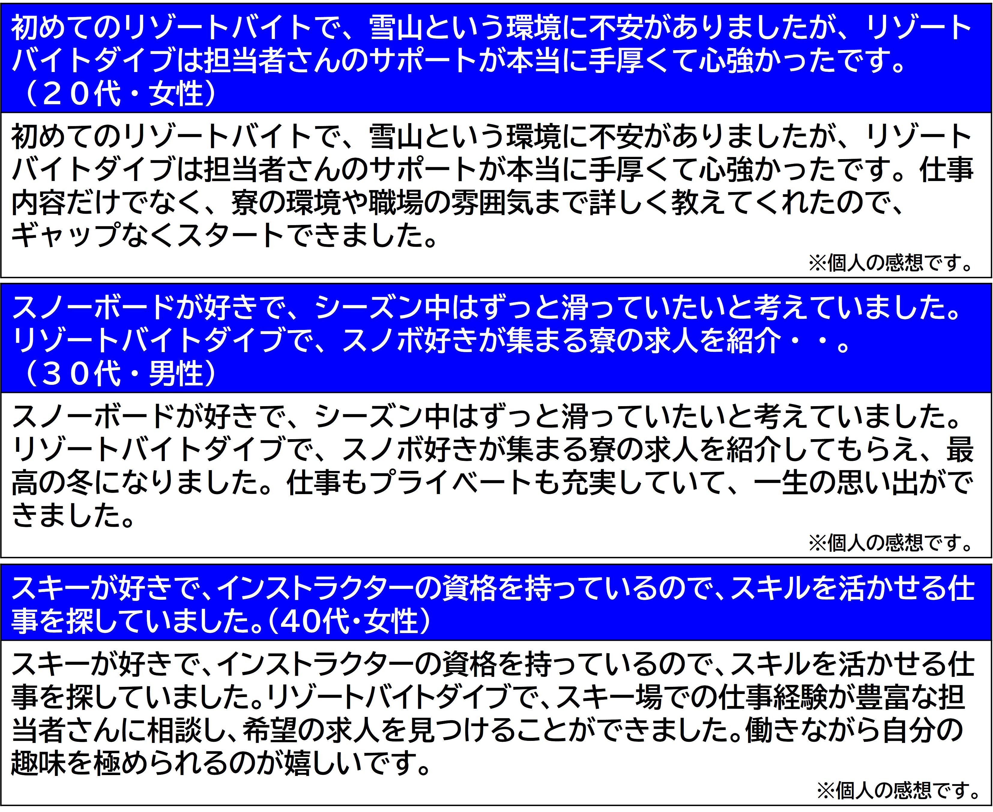 初めてリゾートバイトをする方、または現地で何かあった時に頼れるか不安な方は、担当者の手厚さやトラブル対応力を重視しましょう。